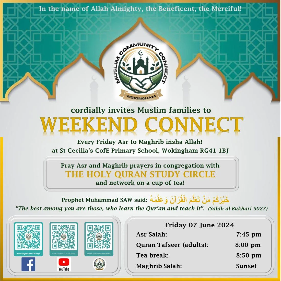 Join us for our Weekend Connect: The Holy Quran Study Circle, where we gather each weekend to delve into the profound teachings of the Quran. Our study circle provides a welcoming space for individuals of all levels to explore and deepen their understanding of the Holy Quran.